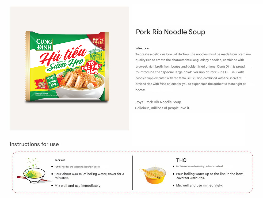 帶有越南風味的方便粉麵系列。「Hủ tiếu」越南叫粿條(又稱金邊粉,是一種方形米粉)的代表菜單之一。 排骨、蝦米、香料等燉煮以增加甜味,並加入炸蔥的味道,打造出濃鬱的湯汁,具有越南典型的風味和味道。 只要加入熱水,3分鐘即可輕鬆煮好泡麵。